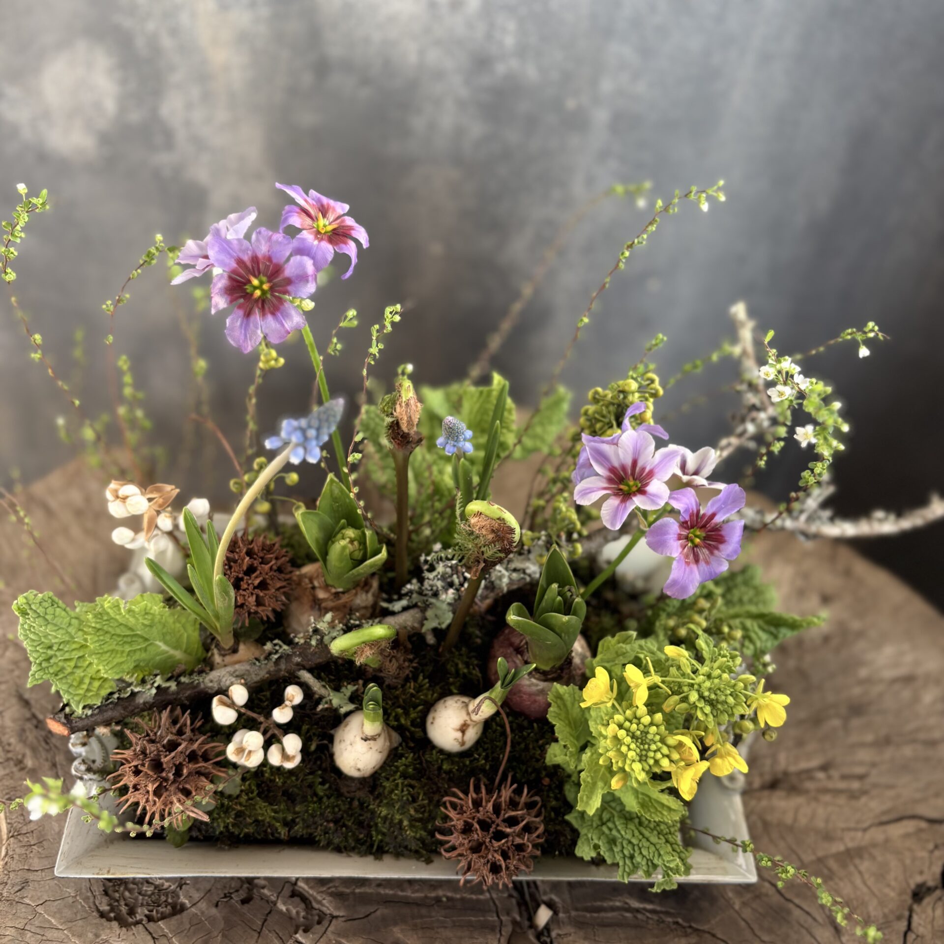 春の球根で、ガーデンの様なアレンジメントを制作していただけます。 球根のお花は、飾りながら育てて頂けますので 春の息吹を室内で感じて頂くことができます。 毎年人気のワークショップです!